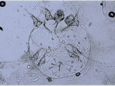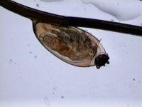 (3)幼虫の大きさは約1~4㎜、色は透けた薄茶色に見える。 幼虫は約1~3 ヵ月かけ5回脱皮して成虫になる (温度により異なる) 。