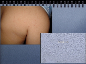 ・強い痒みを伴う紅斑と丘疹、それらを掻きこわします。吸血後、症状が早くあらわれる方は過去に吸血された経験がある人です。当院で経験した患者さんでは、片側足首より始まり、敷物や畳の縁に接する腕、首・顔、お腹(薄着でお腹が出ていたか)に症状がありました。同室にいる家族にも症状がありました。