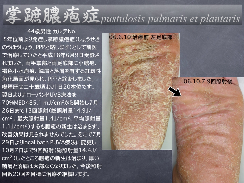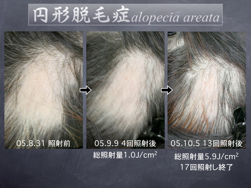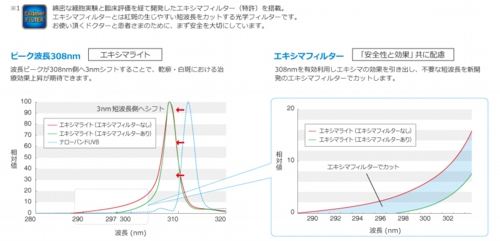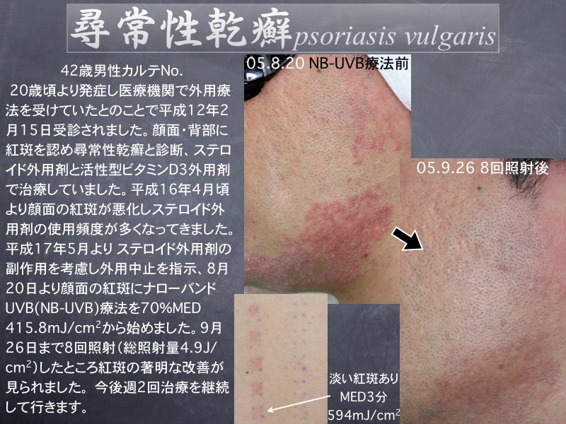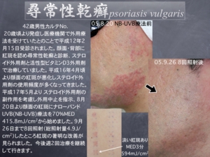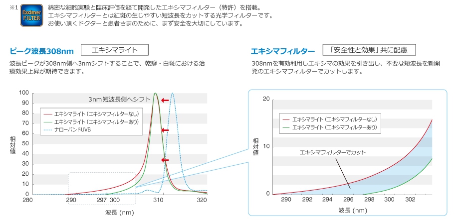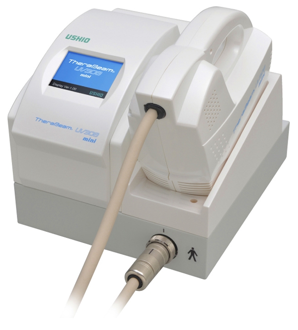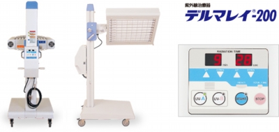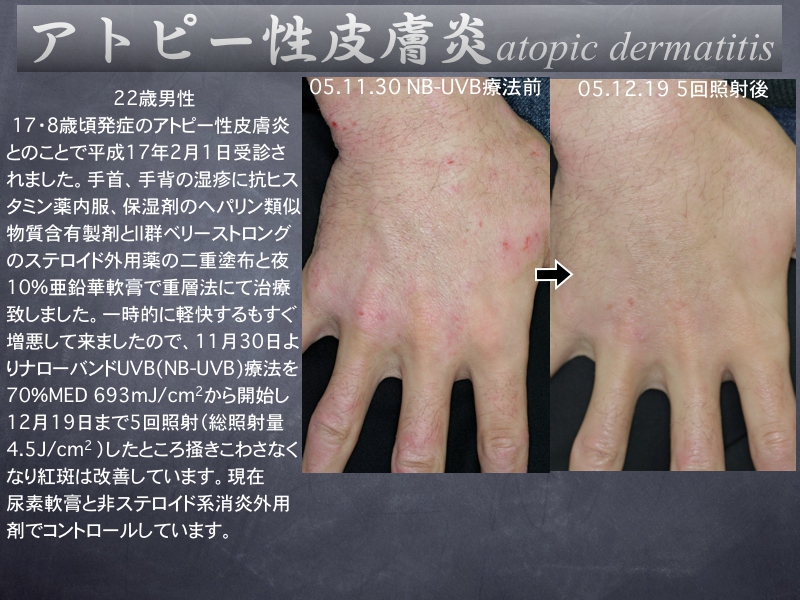 - (4)紫外線療法:アトピー性皮膚炎に保険適応である紫外線療法は、ナローバンドUVB療法とターゲット型エキシマライト照射療法があります。原則として、アトピー性皮膚炎にはナローバンドUVBで皮疹がない部位を含めた全身照射が望ましいと思われます。全身照射あるいは内服・外用治療で治りにくい病巣(特に苔癬化病変と痒疹)に、ターゲット型エキシマライトで追加照射するのも効果的です。勿論難治性の苔癬化病変と痒疹のみに、ターゲット型エキシマライト照射療法を行うことも出来ます。ナローバンドUVB療法とターゲット型エキシマライト照射療法は、組み合わせ治療が可能です。薬物療法で痒みと強い炎症を伴う皮疹が改善されない患者様のなかに、数回〜5回位の紫外線療法で改善させることが可能な症例があります。