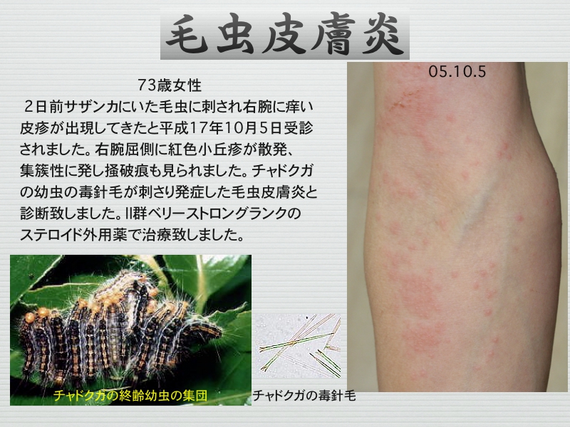 - チャドクガは、本州、四国、九州では5〜6月、8〜9月の年に2回、卵から孵化して幼虫(毛虫)になり、公園や人家の庭のツバキ、サザンカの葉を食害します。毛虫には数十万本以上の微細な毒針毛があり、毒針毛が皮膚に触れると2・3時間で赤く腫れ痒くなります。2度目以降は、アレルギー反応によって痒みを伴う紅斑と紅色丘疹(赤いブツブツ)が出現します。部位は、首、腕など露出部に出ることが多いですが、シャツの襟や袖から中に入ってしまったり、洗濯物についていたりすると被覆部にも皮疹が出てきます。また成虫の尾端についている毒針毛や樹木に残っている毒針毛によって、発症することがあります。毒針毛が刺さっていれば、ガムテープなどを貼って除去し、水で洗い流して下さい。痒みと炎症症状が強い場合は、皮膚科を受診下さい。抗ヒスタミン薬内服、ベリーストロングランクのステロイド外用薬で治療し、1週間以内には改善します。