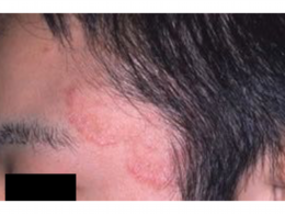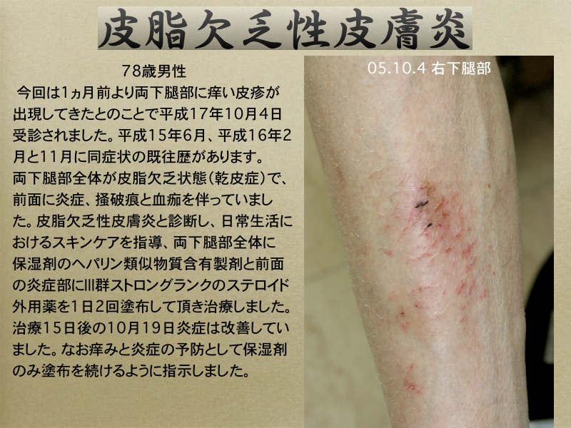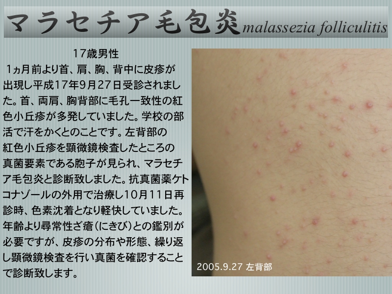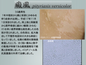 - (2)成人期脂漏性皮膚炎:頭皮、眉毛から眉間、鼻唇溝、耳介内側と後面、胸背部に好発し、時に間擦部すなわち腋窩、乳房下、臍部、股部に、脂性あるいは乾いた鱗屑が付着した黄色調の紅斑が見られます。頭皮でフケ症を訴え、体幹はしばしば長円形の紅斑局面を多発します。痒みは軽度です。病状は、寛解と増悪を繰り返し、生活習慣病と伴に慢性化する方がいます。