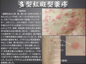 - (e)外用剤と接触皮膚炎:抗菌外用薬、ステロイド外用薬、非ステロイド系外用薬、点眼薬(アミノグリコシド系抗菌薬が多い)、抗真菌薬(使用頻度の高いイミダゾール系抗真菌薬が多い)、湿布薬などが原因となります。