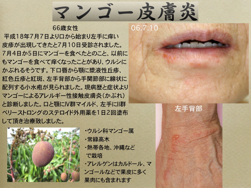 - (b)食物と接触皮膚炎:マンゴー(ウルシとの交差感作あり)、カシューナッツオイル、ギンナン、キク科・ユリ科・セリ科植物他、香辛料、ハーブ、プロポリスなどが原因となります。