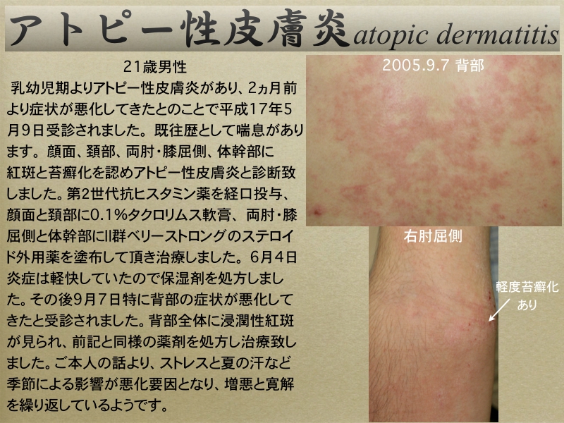 四肢屈側型、四肢伸側型、小児乾燥型、成人に多い上半身型、痒疹型、全身型、これらを混在する症例が多い