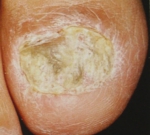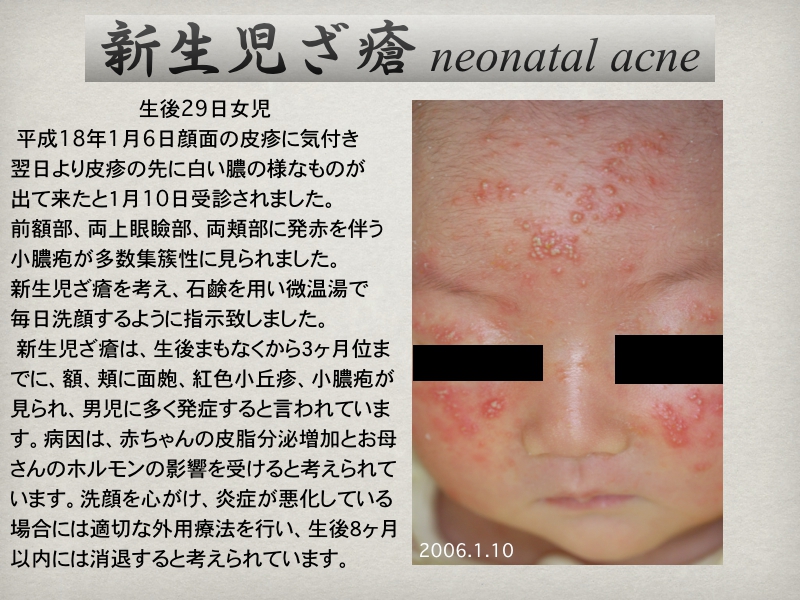 - (1)乳児脂漏性皮膚炎:生後まもなく、乳痂(脂性の厚い痂皮)で覆われた紅斑が頭皮、顔面、おむつ部に見られます。原発疹として、毛孔一致性の紅色丘疹が同部位に見られます。予後は良好で、数ヶ月以内に軽快し、1歳位までに治癒します。