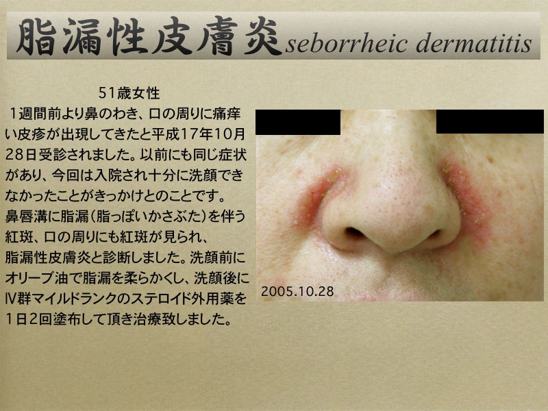 - 脂漏性皮膚炎は、日常診療でしばしば遭遇する皮膚病で皮疹の性状と分布から典型例の診断は比較的容易ですが、症例により鑑別が困難なこともあります。発症時期により、乳児脂漏性皮膚炎と成人期脂漏性皮膚炎に分類されますが、発症に連続性はありません。