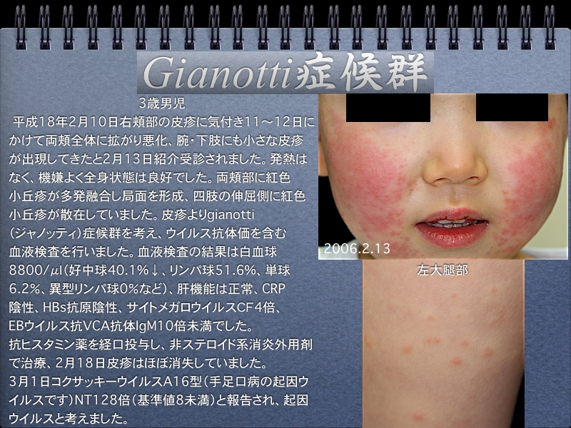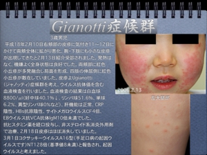 - 乳児期:頭、顔にはじまりしばしば体幹、四肢に下降