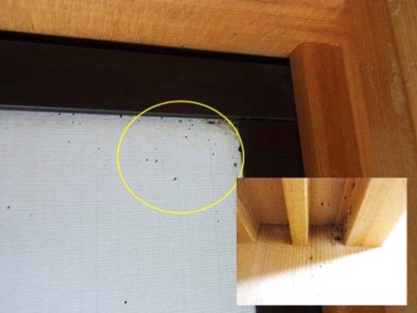(5)虫の生息場所には糞(血糞、乾燥後は小さな黒い点々にみえる)が見られる。糞が多い所には卵・幼虫・成虫もよく見られる。