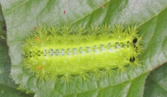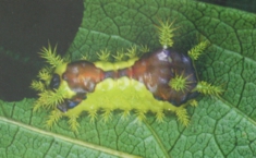 - (2)毒棘型:イラガ科の幼虫(毛虫)には鋭い毒棘があり、これに触れると先端部から毒液が注入され、その毒成分の刺激によって激しい痛みが出現し、同時に紅斑、膨疹が見られますが数時間で軽快します。その後、個人差はありますが、毒成分に対するアレルギー反応で紅斑、腫脹が生じる場合があります。このタイプは、イラガ、アオイラガ、ヒロヘリアオイラガなどイラガ科のものがあります。