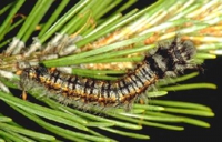 - マツカレハは、毛虫の時期は4月頃で、公園や人家の庭のアカマツ、クロマツ、カラマツなどの針葉を食べます。
