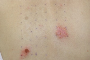 背部に金属アレルゲンのパッチテストを実施 パラジウム(左)とニッケルに陽性