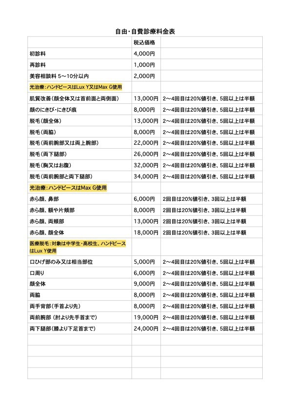 - 光治療初回の方は、令和4年9月28日より以下の如く治療費を変更致します。
