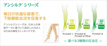 - アンシルクシリーズは、日本人の脚の研究と体型データの分析から開発した日本人のための医療用弾性ストッキングです。足首の圧迫圧を最大とし、大腿部に向けて段階的に圧迫圧を減少させるC&G(Compression & Gradation)機能により、下肢静脈血流を促進します。また、透明感のある薄手の生地と心地よい引き締め感で、毎日の装着を快適にサポートします。