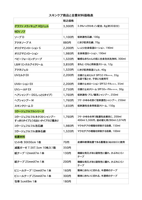 - 上記以外の、乾燥肌スキンケアのIIIシリーズ、敏感肌スキンケアのIIシリーズ、敏感肌エイジングケアのL&Wシリーズ、にきびケアのシリーズ、そしてお肌にやさしいメイクアップ(ベースメイクとポイントメイクあり)などは注文販売となりますので、受付でお申し付け下さい。