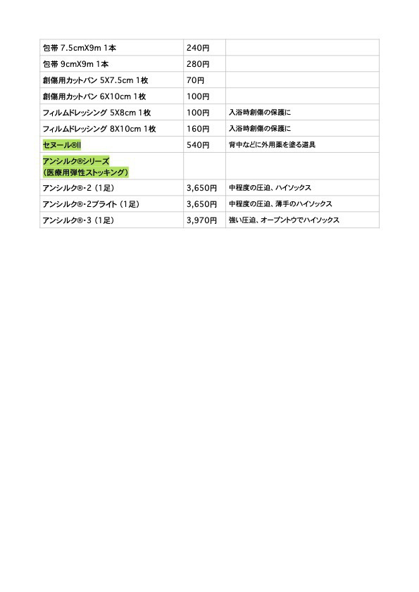 - フィルムドレッシング(入浴時創傷保護に):5X8cm 1枚100円、8X10cm 1枚160円。